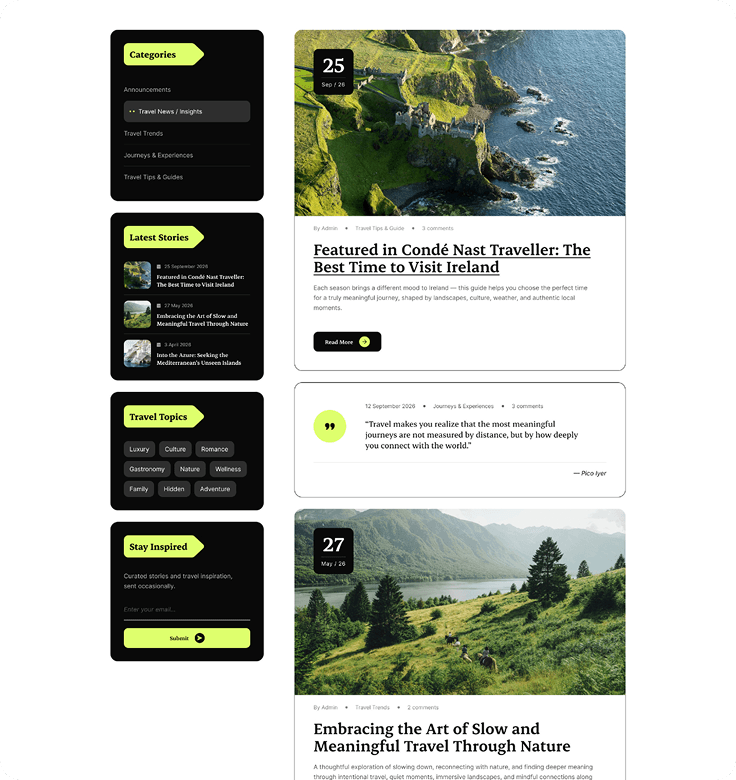 Bring your stories to life with clean, modern blog layouts that are easy to customize, fully responsive, and built to captivate your audience.
